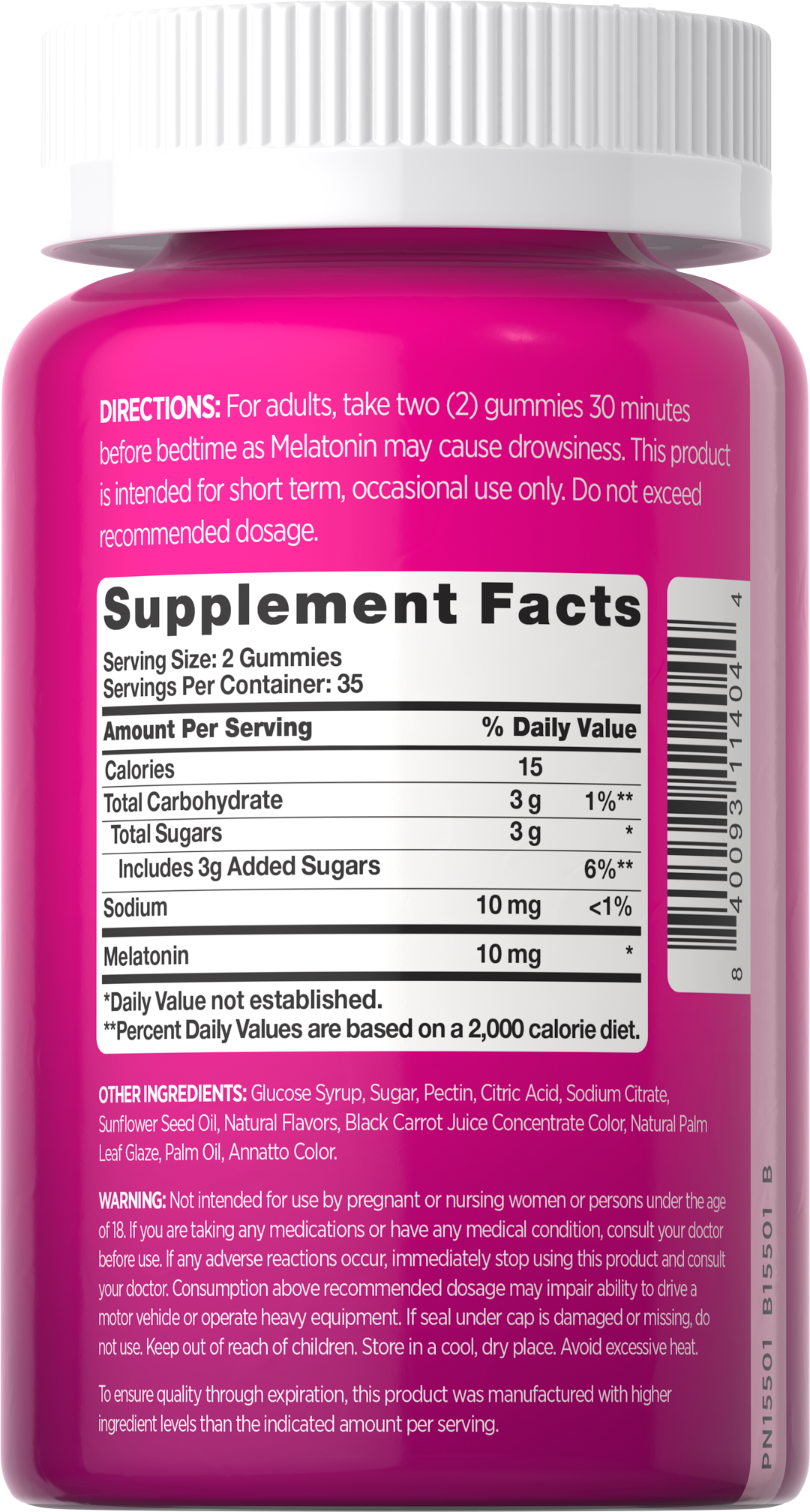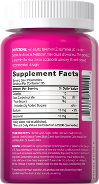 - Two gummies supply 10 mg of clinically studied Melatonin
